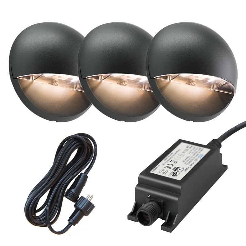 This kit comes with 3 x Vidar wall lights, 1 x 8mtr SPT-1 cable and 1 x transformer (12W or 24W). To work out which transformer is best for you, simply add up the total wattage of the lights and pick the transformer that is either the same number or bigger. An example of this would be 13 x Vidar wall lights = 13W, you would therefore need the 24W transformer. The 8mtr cable in this kit is a plain cable allowing you to connect the lights anywhere along that length of cable. You don't need additional connectors as each light comes with it's own connector.